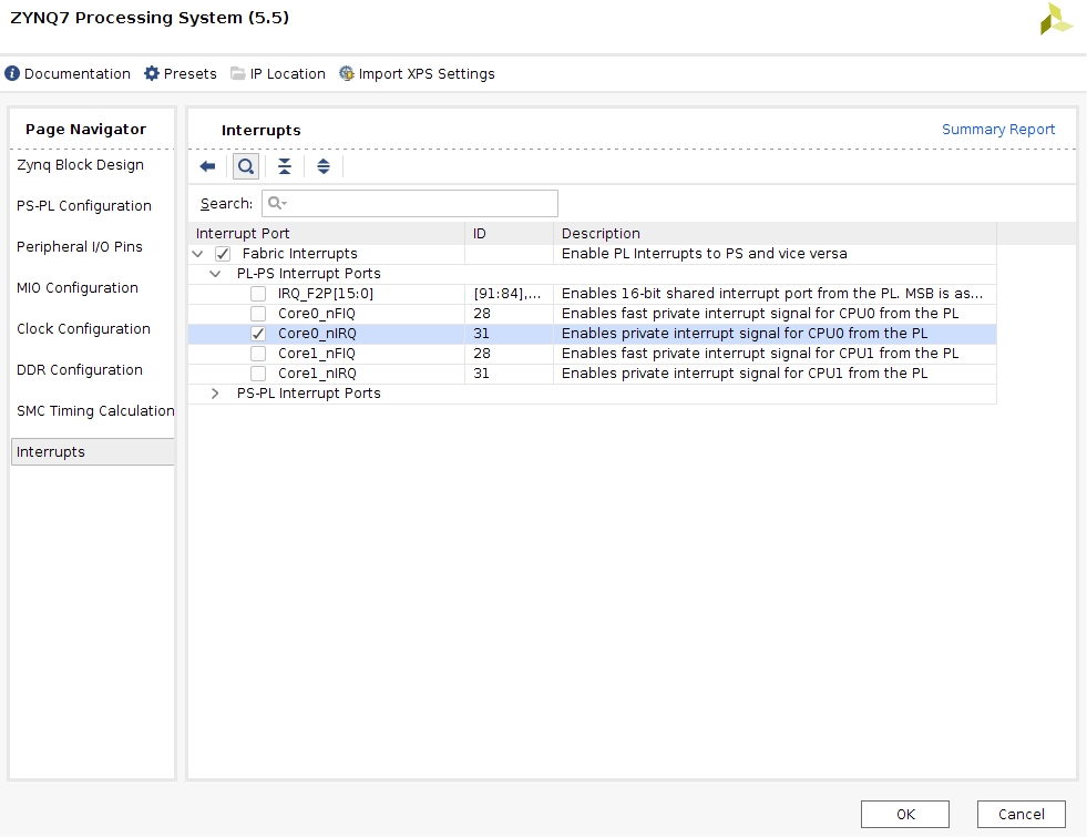 Click “OK”. The ZYNQ block in your design should now have an extra input port called “Core0_nIRQ”