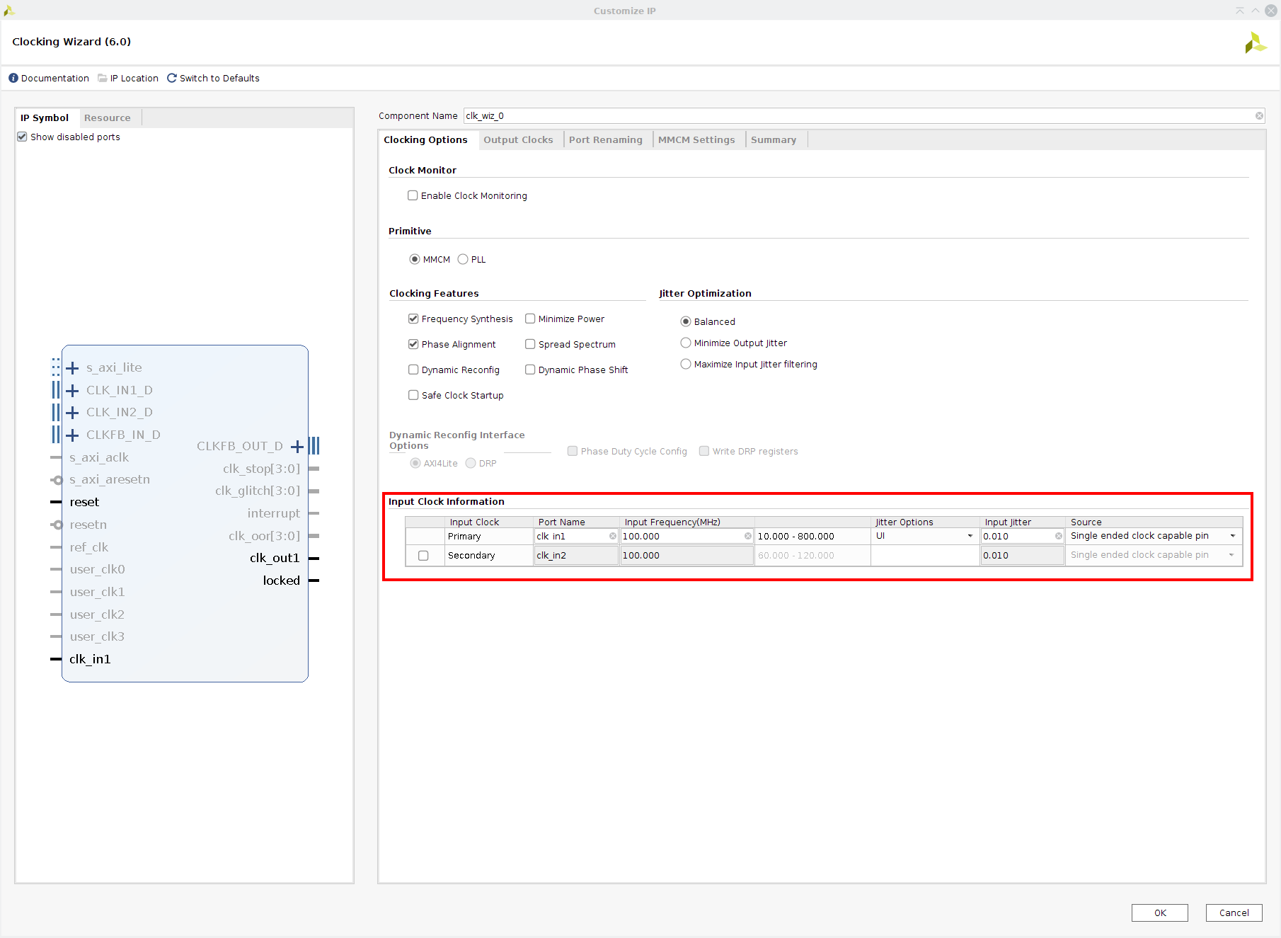 In the Clocking Options tab, leave the default settings for Primitive (MMCM), Clocking Features (Frequency Synthesis and Phase Alignment), and Jitter (Balanced). These settings are the most typical for most clock signals. In the Input Clock Information panel, enter your system’s input clock frequency (100MHz for Real Digital boards), and leave the defaults for Jitter (UI) and Source (Single ended clock capable pin).