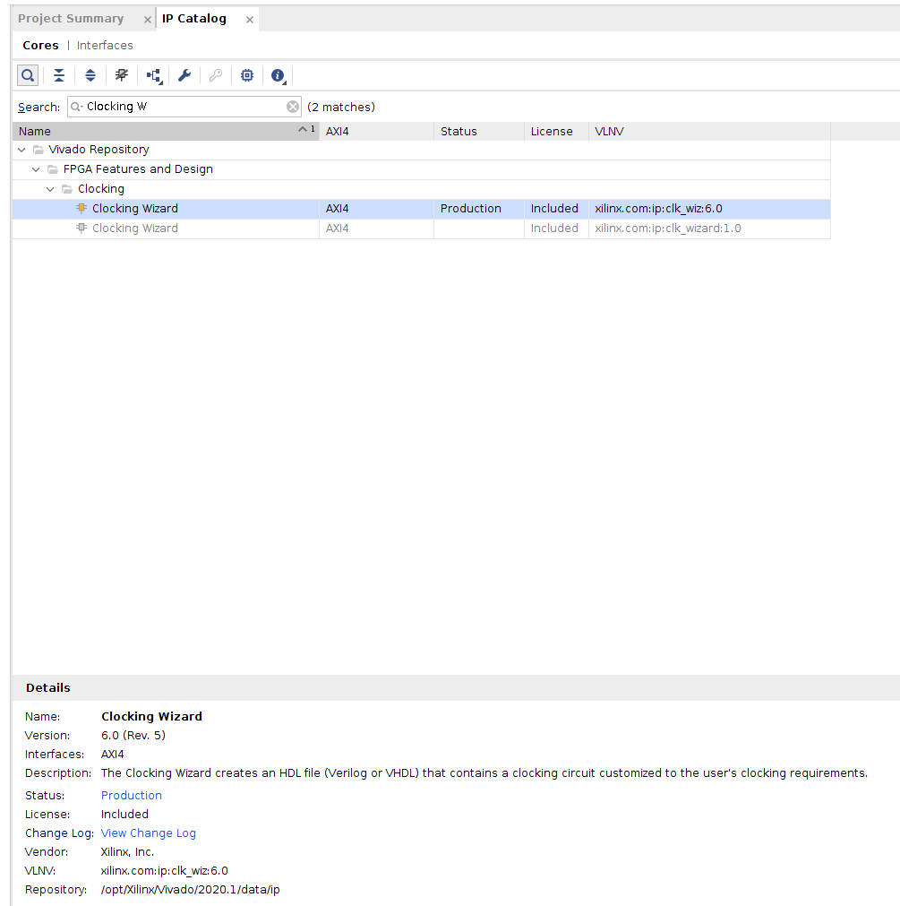 Double-click on the Clocking Wizard entry to start the Wizard.