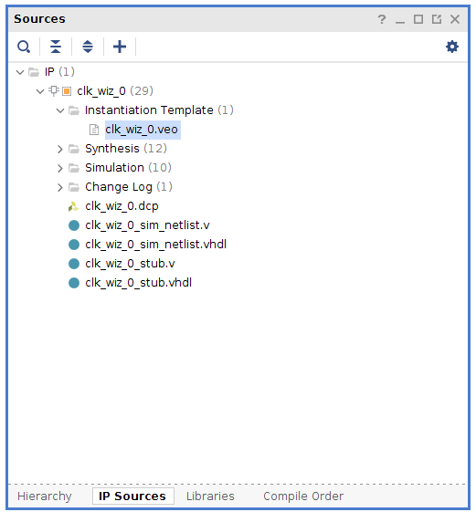 Output products include the Verilog source files, and also a template you can cut/paste into your project source file to instantiate the IP block. If you are curious, you can view the resulting code, find the instantiation of the CMT, and see the divider values (and other parameters) the Wizard populated. To view the instantiation template, select the “IP Sources” tab at the bottom of the the Sources window in the Project Manager.