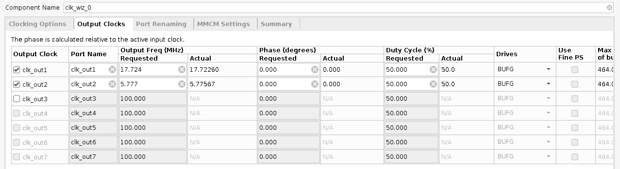 In the Output Clocks tab, you can define up to seven output clocks by entering the desired output frequencies in the “Requested” boxes under Output Freq (MHz). For a VGA controller and VGA-to-HDMI block, two clocks (25MHz and 125MHz) are needed. In the example shown, two random clocks were requested. Based on the requested target frequencies, the Wizard will produce the closest attainable output frequencies. Note that not all frequencies can be produced exactly due to the limited precision achievable when multiplying and dividing clock frequencies. If, for example, 17.724MHz was entered as shown, the “Actual” box will show 25.72260MHz – that is the closest frequency that is possible to produce. Likewise, you can enter a requested clock phase (0 means no phase delay) and duty cycle (50 means the clock waveform is high 50% of the time), and the Wizard will report the closest attainable result.