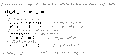 The Verilog code below provides and example of instantiating a CMT IP block produced by the clocking wizard. The code uses the template produced in the example shown above.